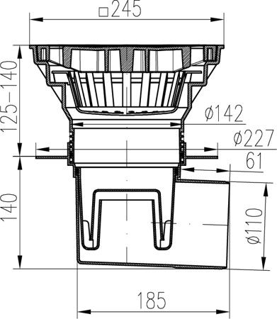 Kanalizační vpusť boční D110-250 suchá klapka, límec, plastová mřížka SUN