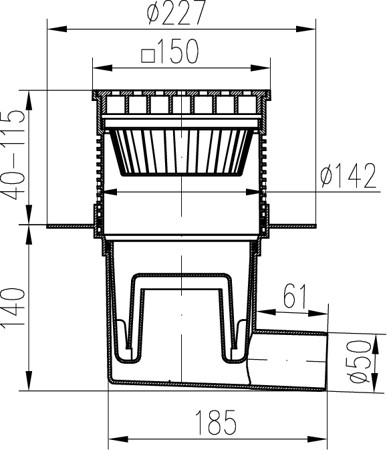 Kanalizační vpusť boční D50, vodní hladina, límec, nerez mřížka