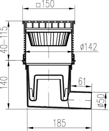 Kanalizační vpusť boční D50, vodní hladina, litinová mřížka