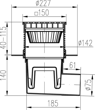 Kanalizační vpusť boční D75, vodní hladina, límec, plastová mřížka