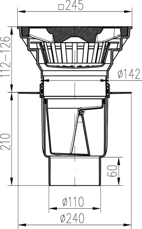 Kanalizační vpusť spodní D110-250 vodní hladina, límec, litinová mřížka SUN