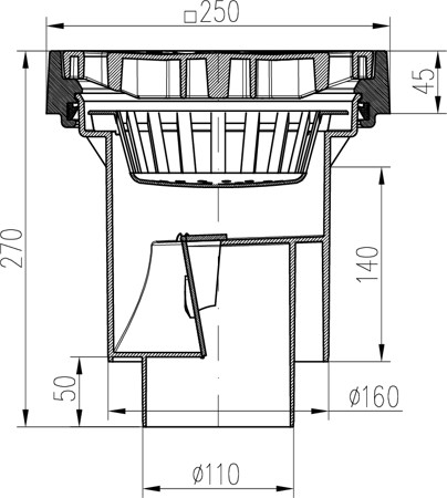 Kanalizační vpusť spodní D160/D110-250 suchá klapka, litinový rámeček, plastová mřížka SUN