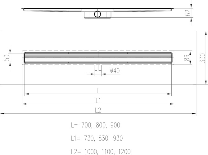 Nízká stavební výška 62 mm, stavěcí podpěry lze nastavit na libovolnou výšku ALU lišty, na montážní ALU lištu lze nalepit dlažbu, sklo, nerez lištu, průtok lineárního žlabu 30-34 l/min. dle normy EN 1253, zatížení lineárního žlabu K3 (300 kg), lisované těleso bez svárů, rozměrová řada 700, 800, 900 mm, snadná demontáž při čistění sifonu, bez limitu výšky obkladu, vyrobeno z vysoce odolné nerez oceli DIN 1.4401 AISI 316, patentovaný odtokový sifon.