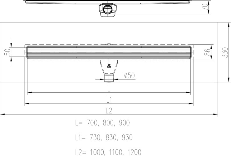 Lineární nerezový žlab AQUARIUS 800 mm s otočným bočním sifonem D50 s izolací s nerez pásem