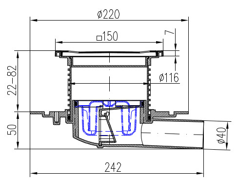 Vpusť je určena pro vnitřní a venkovní použití. Obsahuje suchou klapku a vodní hladinu. Vyrobeno z PP, PS a nerezové oceli DIN 1.4301. Zatížení K3-300 kg, odolnost do 90°C, zkoušeno dle normy EN 1253.