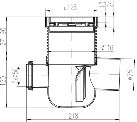 Vpusť umožňuje připojení více odpadních systémů v kanalizační síti. Těleso vpusti je vybaveno vodní protizápachovou přepážkou. V případě potřeby napojení hydroizolace lze kombinovat s límcem pro izolaci (390). Vyrobeno z PP a nerezové oceli DIN 1.4301. Zatížení K3-300 kg, odolnost do 90°C, zkoušeno dle normy EN 1253.