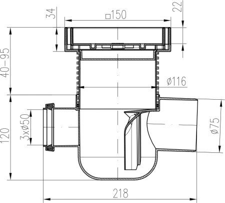 Podlahová vpusť boční D50/75 MULTI, nerez rámeček, mřížka STEEL 150