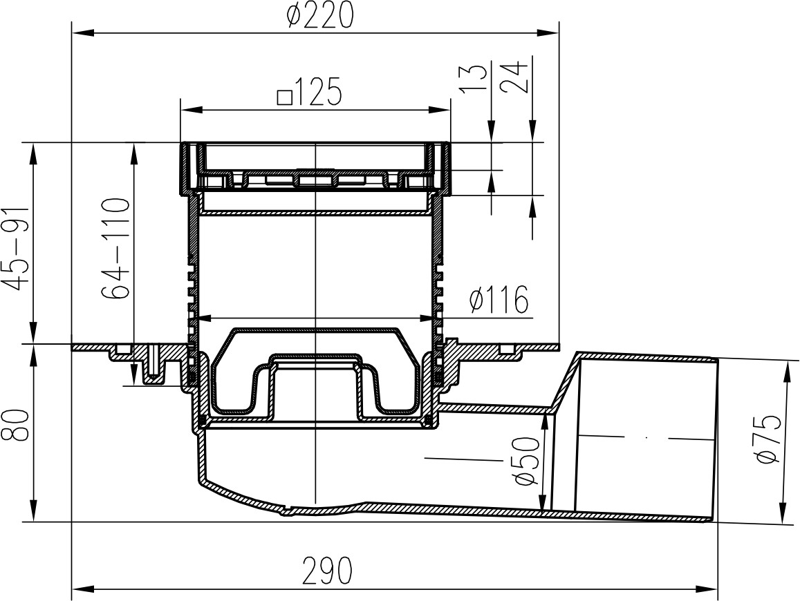 Podlahová vpusť boční D50/75 NEPTUN, nerez příruba, rámeček, mřížka CERAMICS 125