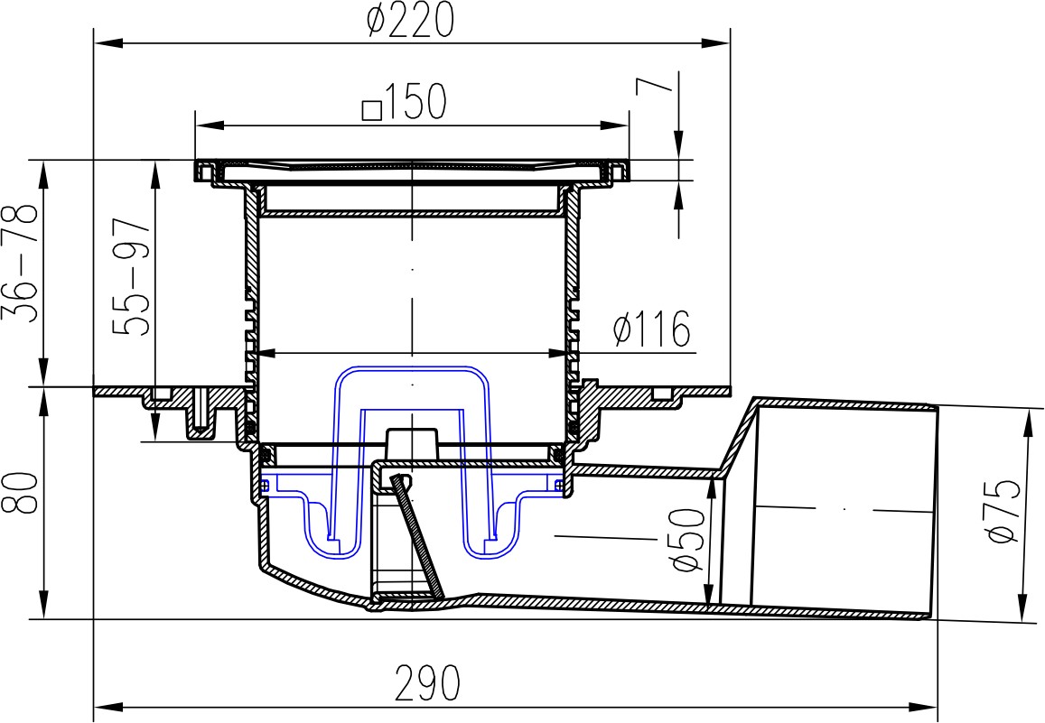 Vpusť je určena pro vnitřní a venkovní použití. Obsahuje suchou klapku a vodní hladinu. Vyrobeno z PP, PS a nerezové oceli DIN 1.4301. Zatížení K3-300 kg, odolnost do 90°C, zkoušeno dle normy EN 1253.