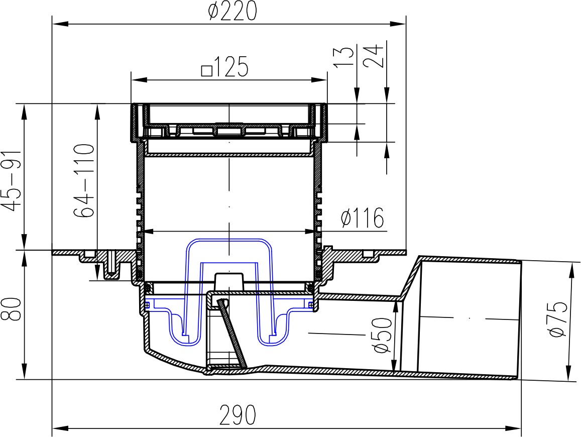 Vpusť je určena pro vnitřní a venkovní použití. Obsahuje suchou klapku a vodní hladinu. Vyrobeno z PP, PS a nerezové oceli DIN 1.4301. Zatížení K3-300 kg, odolnost do 90°C, zkoušeno dle normy EN 1253.