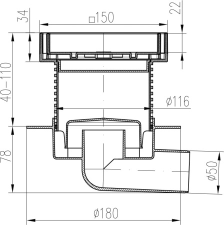 Podlahová vpusť boční D50, límec, nerez rámeček, mřížka STEEL 150