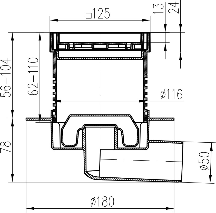 Podlahová vpusť boční D50, NEPTUN, límec, nerez rámeček, mřížka CERAMICS 125