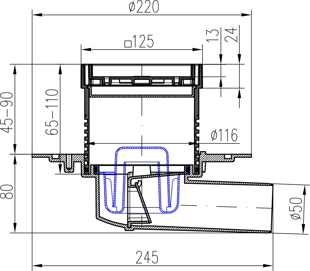 Vpusť je určena pro vnitřní a venkovní použití. Obsahuje suchou klapku a vodní hladinu. Vyrobeno z PP, PS a nerezové oceli DIN 1.4301. Zatížení K3-300 kg, odolnost do 90°C, zkoušeno dle normy EN 1253.