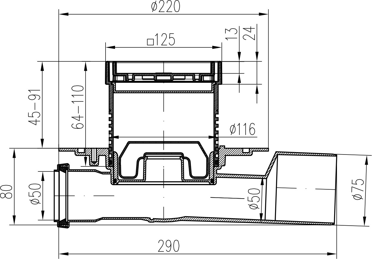 Podlahová vpusť průběžná D50/75 NEPTUN, nerez příruba, rámeček, mřížka CERAMICS 125