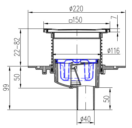 Podlahová vpusť spodní D40, nerez rámeček, mřížka SUN 150