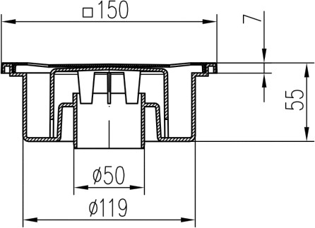 Podlahová vpusť spodní D 50/55 s vodní hladinou a nerezovou mřížkou je určena pro vnitřní použití do technických prostor, koupelen apod.
