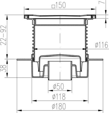 Podlahová vpusť spodní D50, límec, nerez rámeček, mřížka SUN 150
