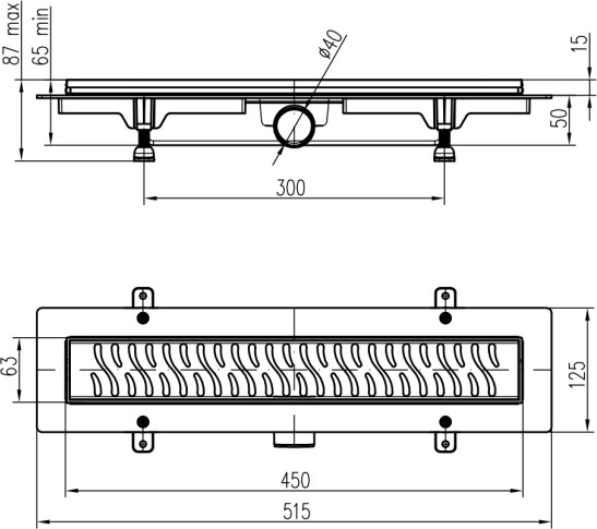Podlahový linear. žlab 450 mm,boční D40,klasik/floor lesk