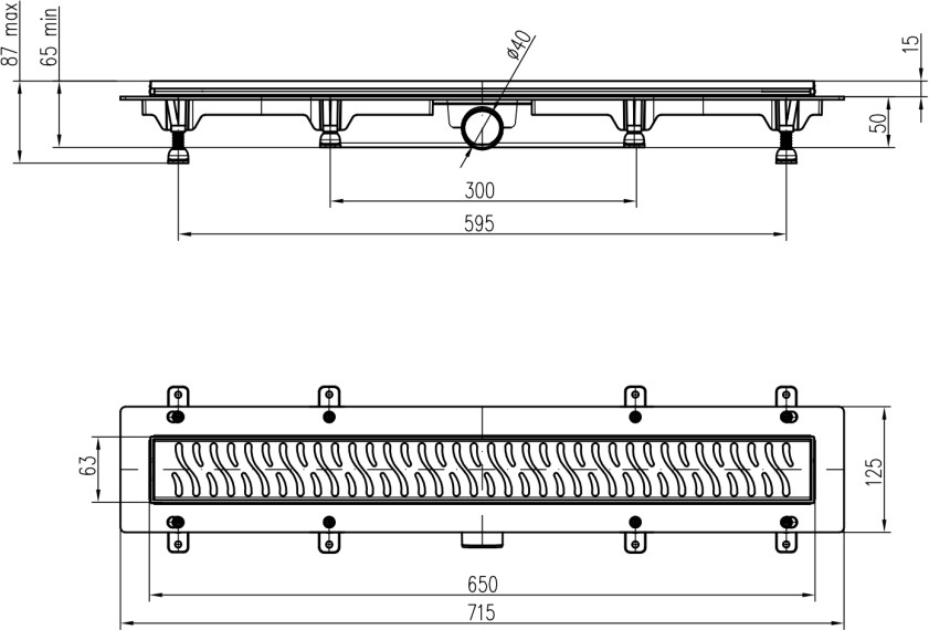 Podlahový linear. žlab 650 mm,boční D40,line mat