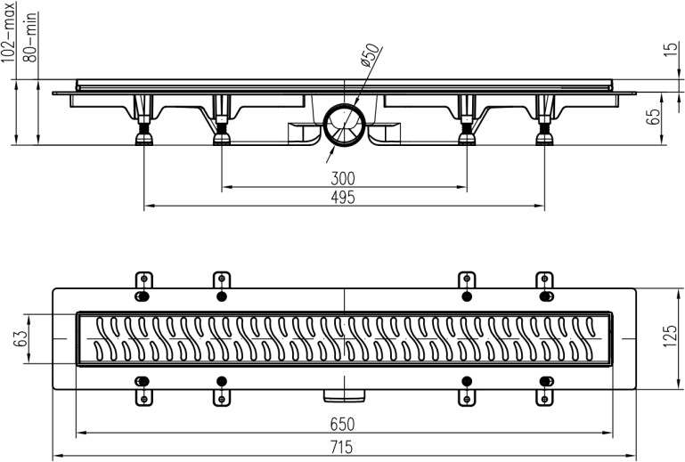 Podlahový linear. žlab černý 650 mm, boční D50, Medium černá