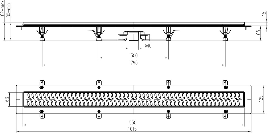 Podlahový linear. žlab černý 950 mm, spodní D40, Klasik/floor černá