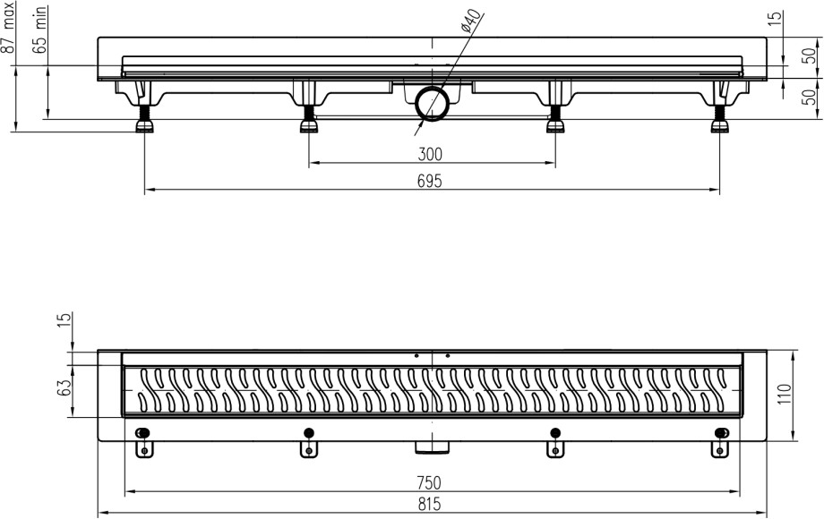 Podlahový linear. žlab ke stěně 750 mm,boční D40,harmony lesk s nerez. rámečkem