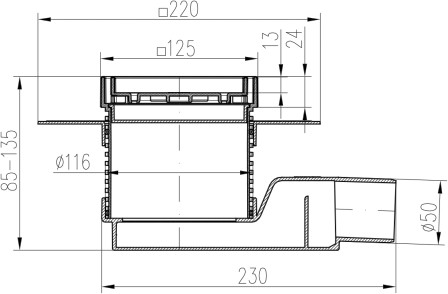 Výhodou výrobku je nízká stavební výška, určeno pro rekonstrukci koupelen. Vyrobeno z PP a nerezové oceli DIN 1.4301. Zatížení K3- 300 kg, odolnost do 90°C, zkoušeno dle normy EN 1253.